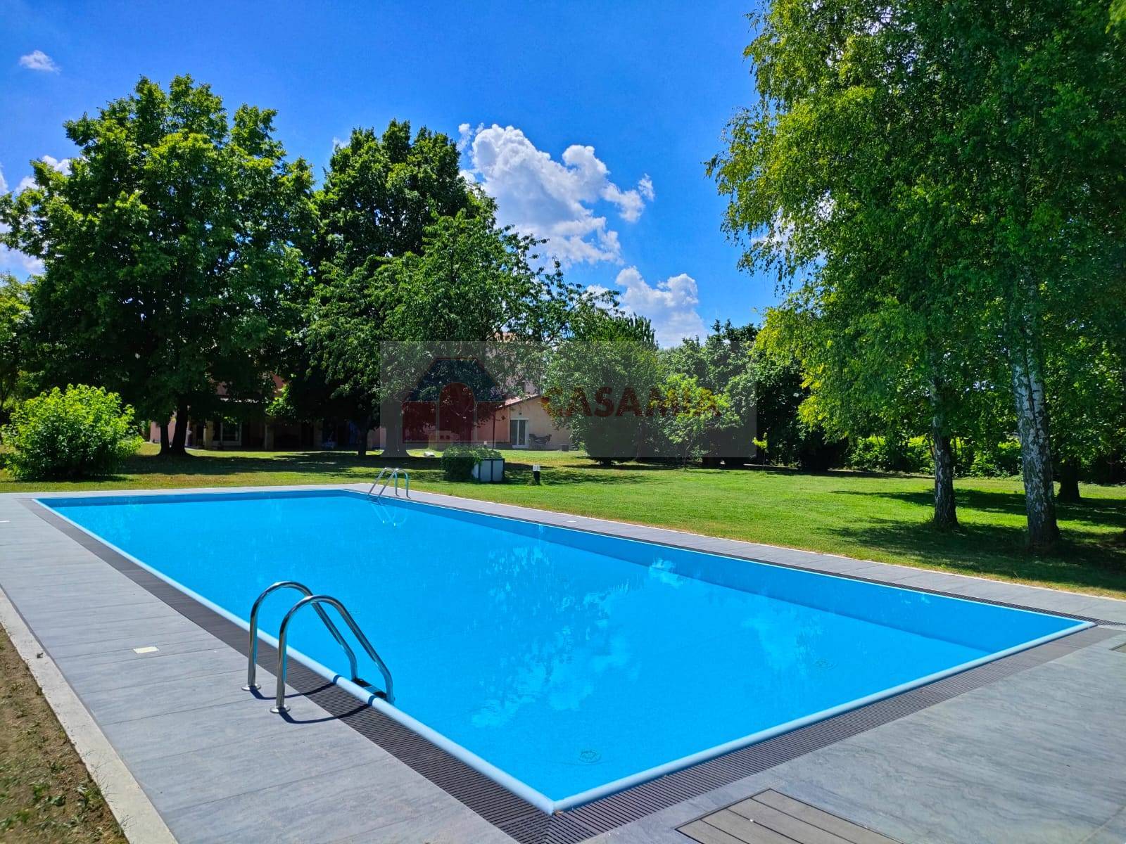 All'ingresso si viene accolti da un ampio soggiorno, inondato di luce naturale grazie alle ampie vetrate con affaccio sul parco privato (di circa 3.000 mq) e la splendida piscina. La cucina è separata ed abitabile a completamento della zona giorno.
